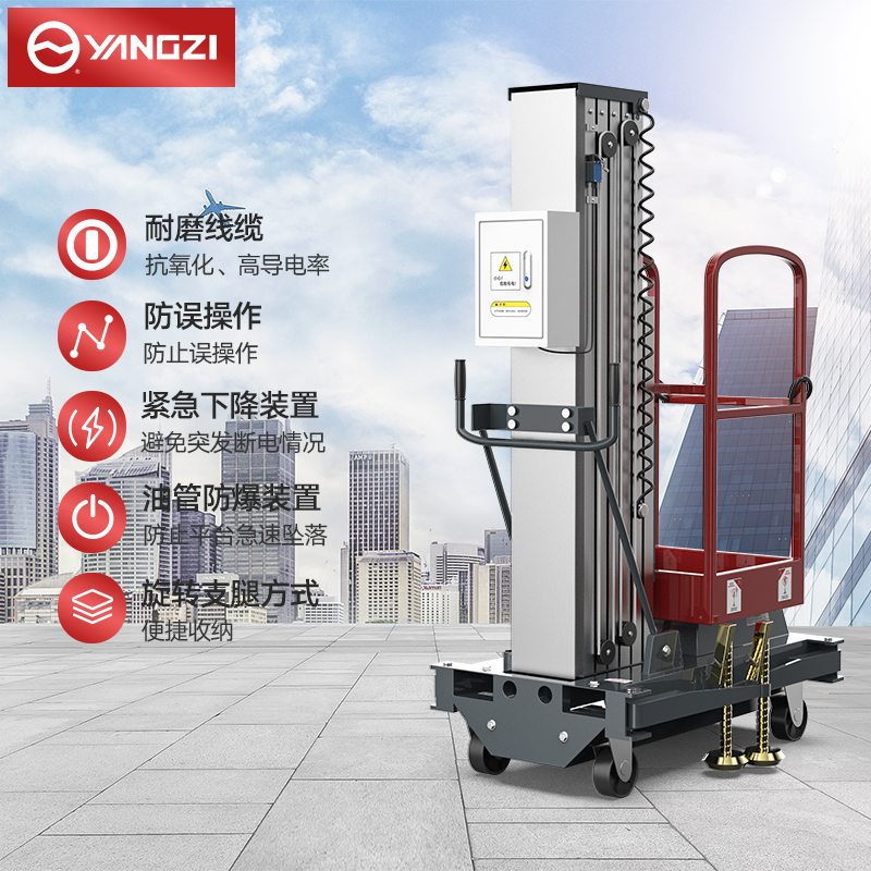 揚(yáng)子平臺(tái)單柱鋁合金升降機(jī)YZDD:機(jī)身預(yù)留有叉車(chē)孔方便機(jī)器升降移動(dòng),更是能配合鏟車(chē)使用,人性化旋轉(zhuǎn)支腿,旋轉(zhuǎn)的支腿方式可以便捷收納機(jī)身更穩(wěn)定。